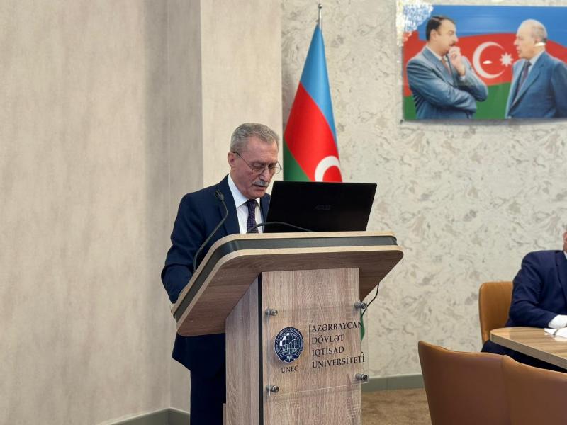 Tədbiri giriş sözü ilə açan fakültə dekanı, dosent Elçin Eyvazov UNEC-də görkəmli alimlərin xatirəsinin uca tutulması ənənəsindən bəhs edərək, bu sahədə universitetdə görülən işlər haqqında ətraflı məlumat verib.