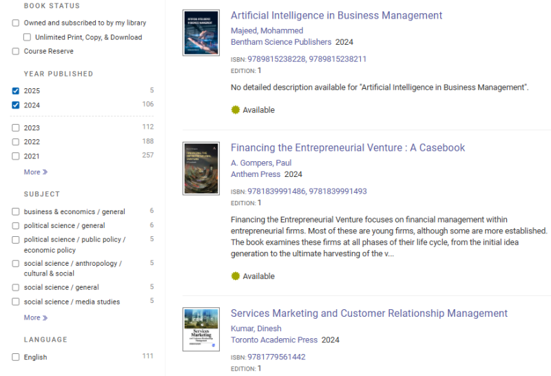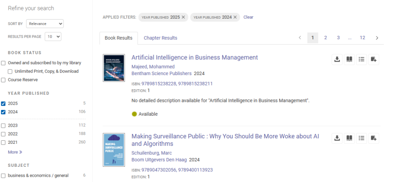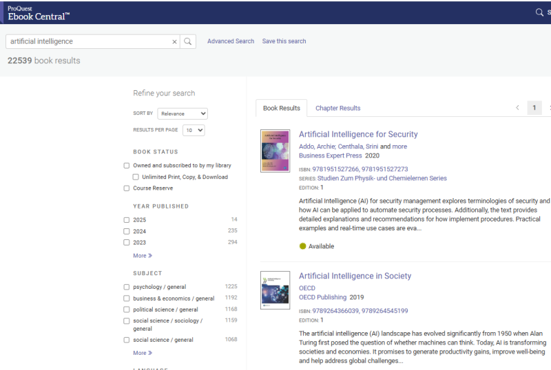 UNEC-in abunə olduğu ProQuestEbookCentral (https://ebookcentral.proquest.com/lib/azerbastat/home.action) bazası üzrə Süni İntellekt (Sİ) mövzusunda araşdırma apardıq. Qeyd edim ki, bazada əsasən dünyanın bir çox nəşriyyatlarında çap edilmiş müxtəlif sahələr üzrə e-kitablar təqdim edilir. Bazada Sİ üzrə 22539 kitab var. Son on illik dövr üzrə apardığımız təhlilin nəticəsinə əsasən bazada 7015 e-kitab aşkar edilib ki, bu kitabların da 1500-ə qədəri iqtisadiyyatın müxtəlif sahələrini əhatə edir. Mövzu üzrə kitabların əksəriyyəti- 6938-i ingilis dilində, 22-si fransız, 21-i alman, 20-si ispan dilində, qalan qismi isə tək-tək olmaqla müxtəlif dillərdədir.