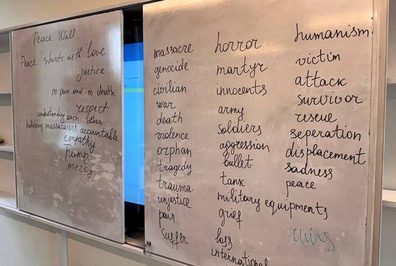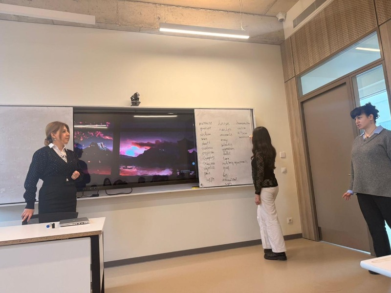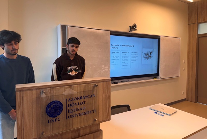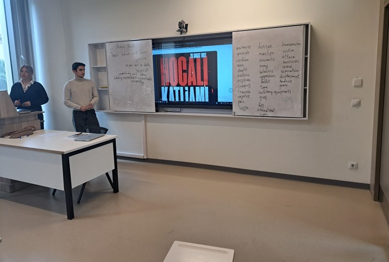 Mövzu ilə bağlı “genocide”, “justice”, “human rights”, “war”, “peace” kimi əsas anlayışlar lövhəyə yazılaraq tələbələrin ingilis dilində fikirlərini daha düzgün və akademik formada ifadə etmələrinə dəstək göstərilib.