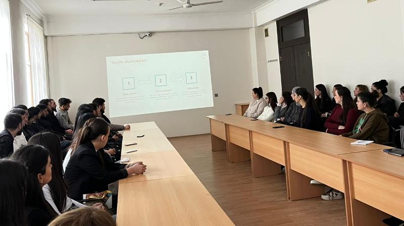Sonra Karyera üzrə mütəxəssis Günay Mansurova “Tələbə-Məzun Təcrübə Proqramı”nı təqdim edib. O, proqramın məqsədi, mərhələləri və iştirak şərtləri barədə ətraflı məlumat verərək, iştirakçıların real iş mühiti ilə tanış olmaq, peşəkar bacarıqlarını inkişaf etdirmək və gələcək karyera imkanlarını genişləndirmək baxımından əldə edəcəkləri üstünlükləri diqqətə çatdırıb.
