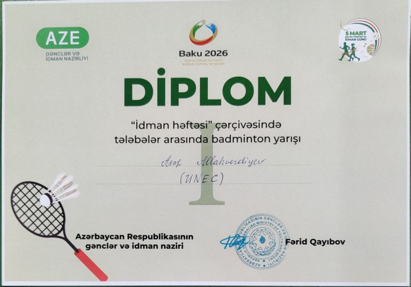 12 universitetdən 38 idmançının qələbə uğrunda mübarizə apardığı badminton yarışında UNEC Biznes Məktəbinin tələbəsi Asəf Allahverdiyev I yeri, Rəqəmsal İqtisadiyyat fakültəsinin tələbəsi Bağır İsmayılov isə III-yeri qazanıb.