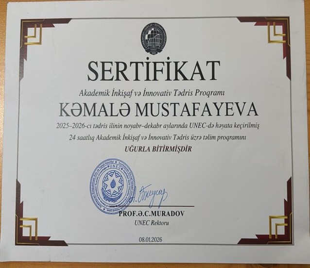 UNEC tərəfindən təşkil olunan müasir təlim proqramına uyğun olaraq Türkiyənin aparıcı universitetlərinin professor-müəllim heyəti tərəfindən keçirilən təlimləri uğurla başa vuraraq hər bir fənn üzrə sertifikata layiq görülmüşdür.