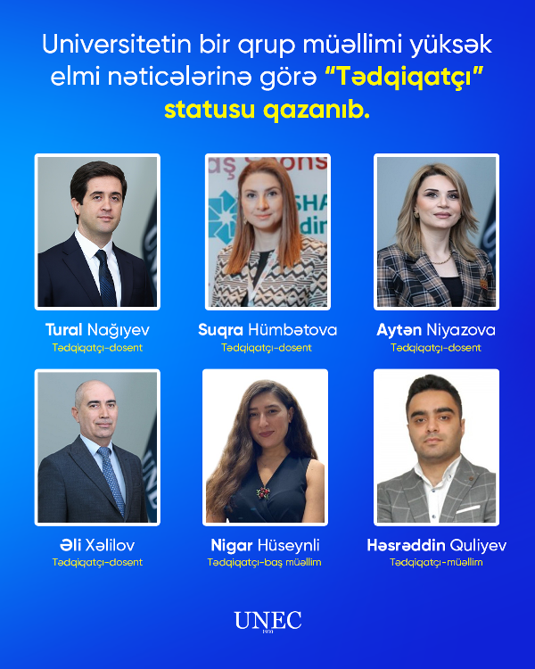 A group of the university’s faculty members has been granted the “Researcher” status in recognition of their high-level scholarly achievements. Sugra Humbatova, Tural Naghiyev, Ayten Niyazova, and Ali Khalilov have been awarded the status of “Researcher-Associate Professor”, Nigar Huseynli has been granted the status of “Researcher-Senior Lecturer”, and Hasraddin Guliyev has been awarded the status of “Researcher-Lecturer.”