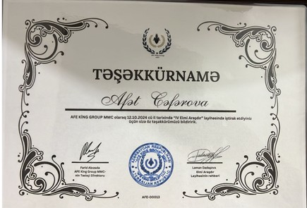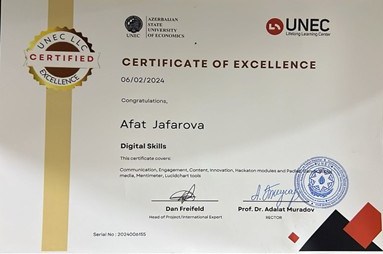 19.06.2023 cü il. Azərbaycan Respublikası İqtisad Universitetinin rektoru prof. Ədalət Muradov tərəfindən Universitetin həyatında fəal iştirakına görə Təşəkkürnamə ilə təltif olunmuşdur.