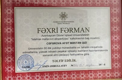 25.11. 2020- ci ildə Azərbaycan Respublikası İqtisad Universitetinin 90 illik yubileyi münasibətilə və təhsilin inkişafında xidmətlərinə , yüksək ixtisaslı peşəkar iqtisadçı kadrların hazırlanmasında səmərəli elmi-pedaqoji fəaliyyətinə görə, Azərbaycan Respublikası Təhsil Nazirliyi tərəfindən Fəxri Fərmanı ilə təltif olunmuşdur.
